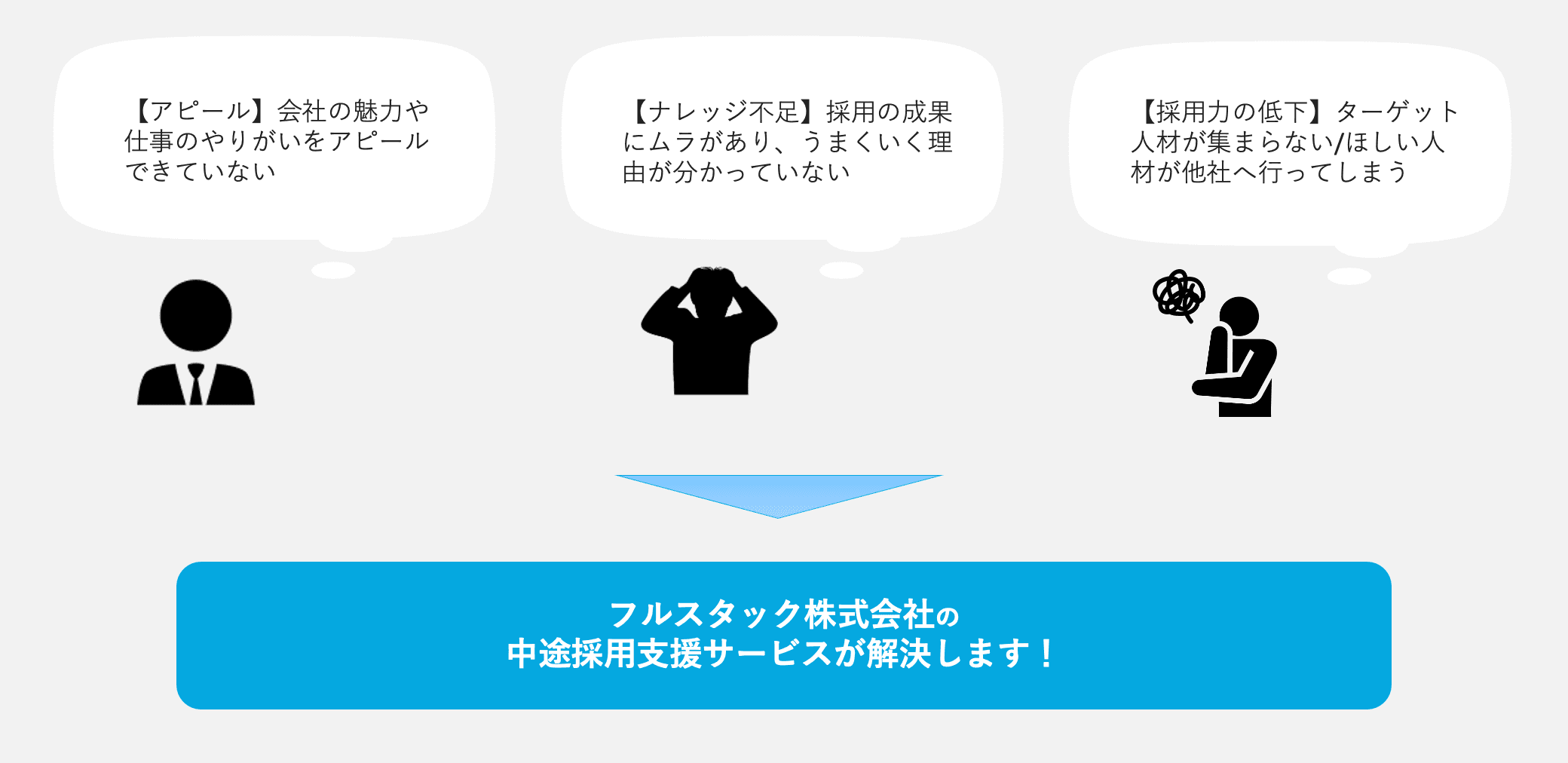 フルスタックの採用支援では、求職者から選ばれるための戦略設計↔︎媒体運用↔︎オペレーション改善支援↔︎広報コンテンツ制作をトータルサポートします。採用課題を解決するコンサルティングだけではなく、改善提案を行った後の実働支援も含めて伴走型の支援を行います。